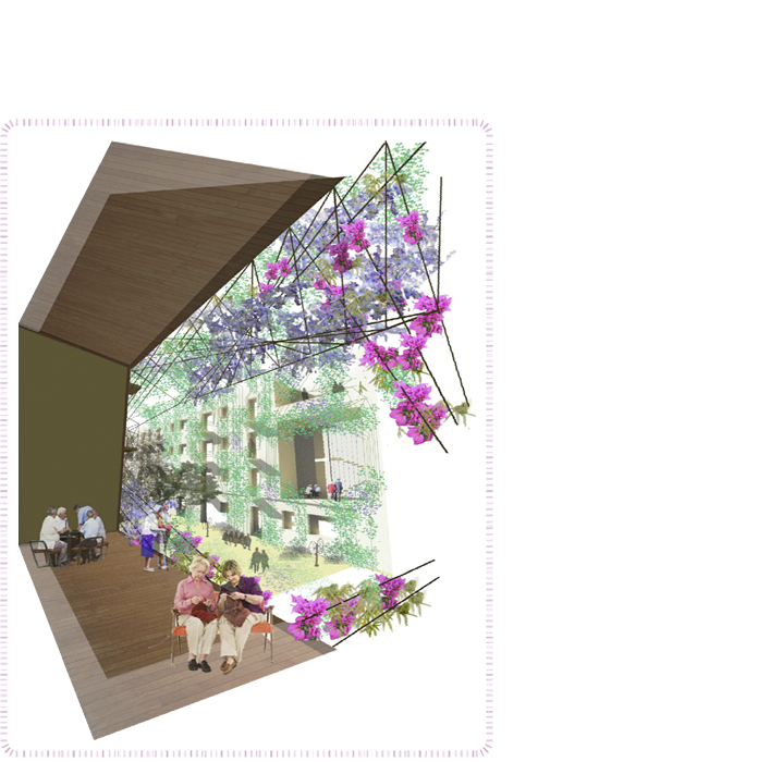 The new facade composition builds a new image, differentiating outside the commons and private housing and day center as well as adapt to the changing needs of internal lighting, and proposing an organic, variable according to seasons and warmed plant second skin.
